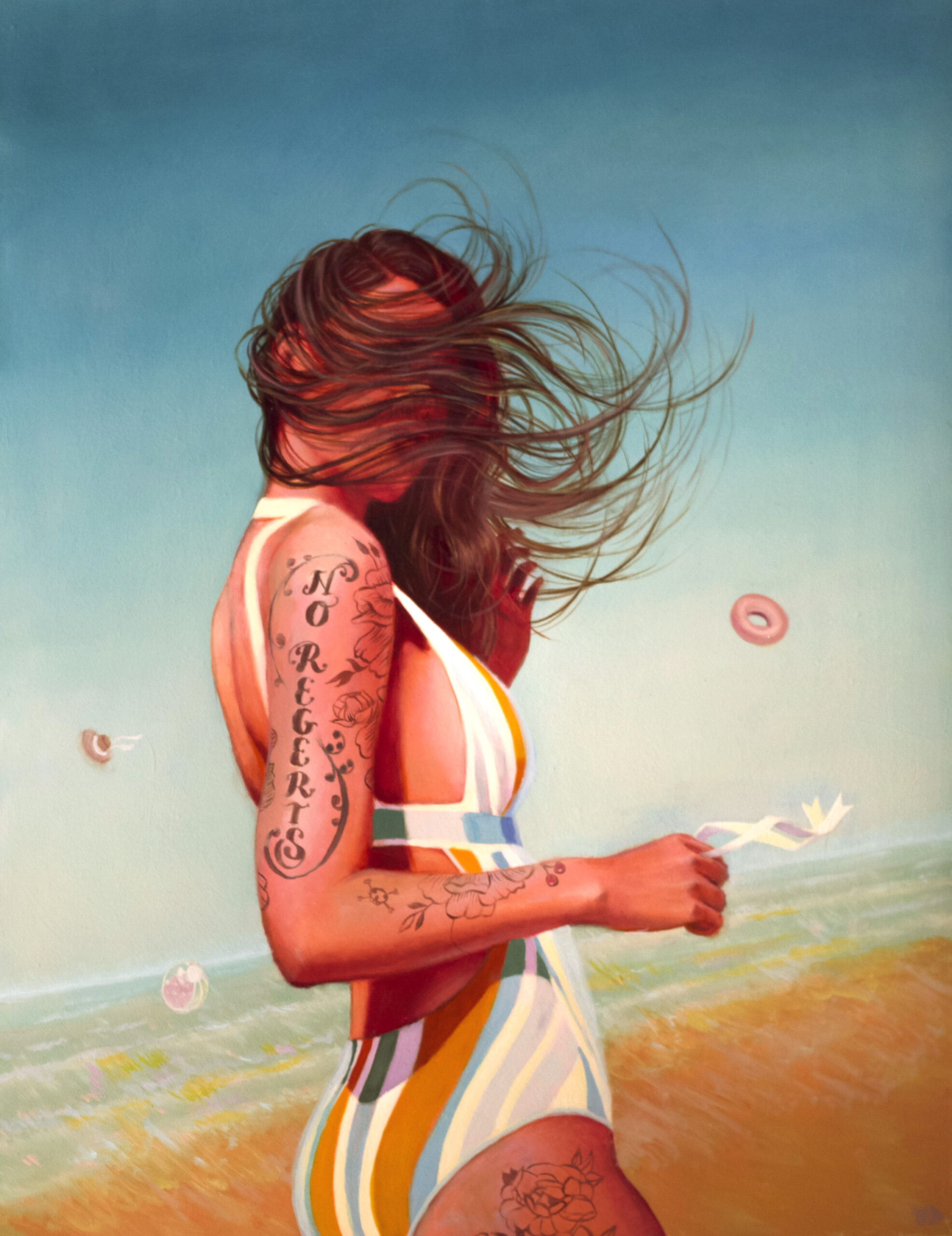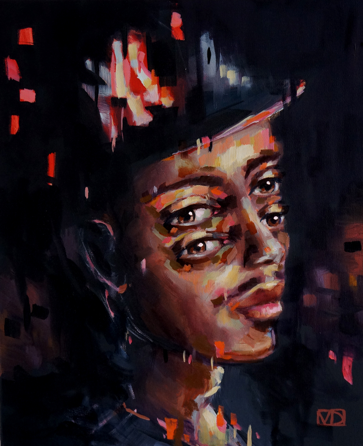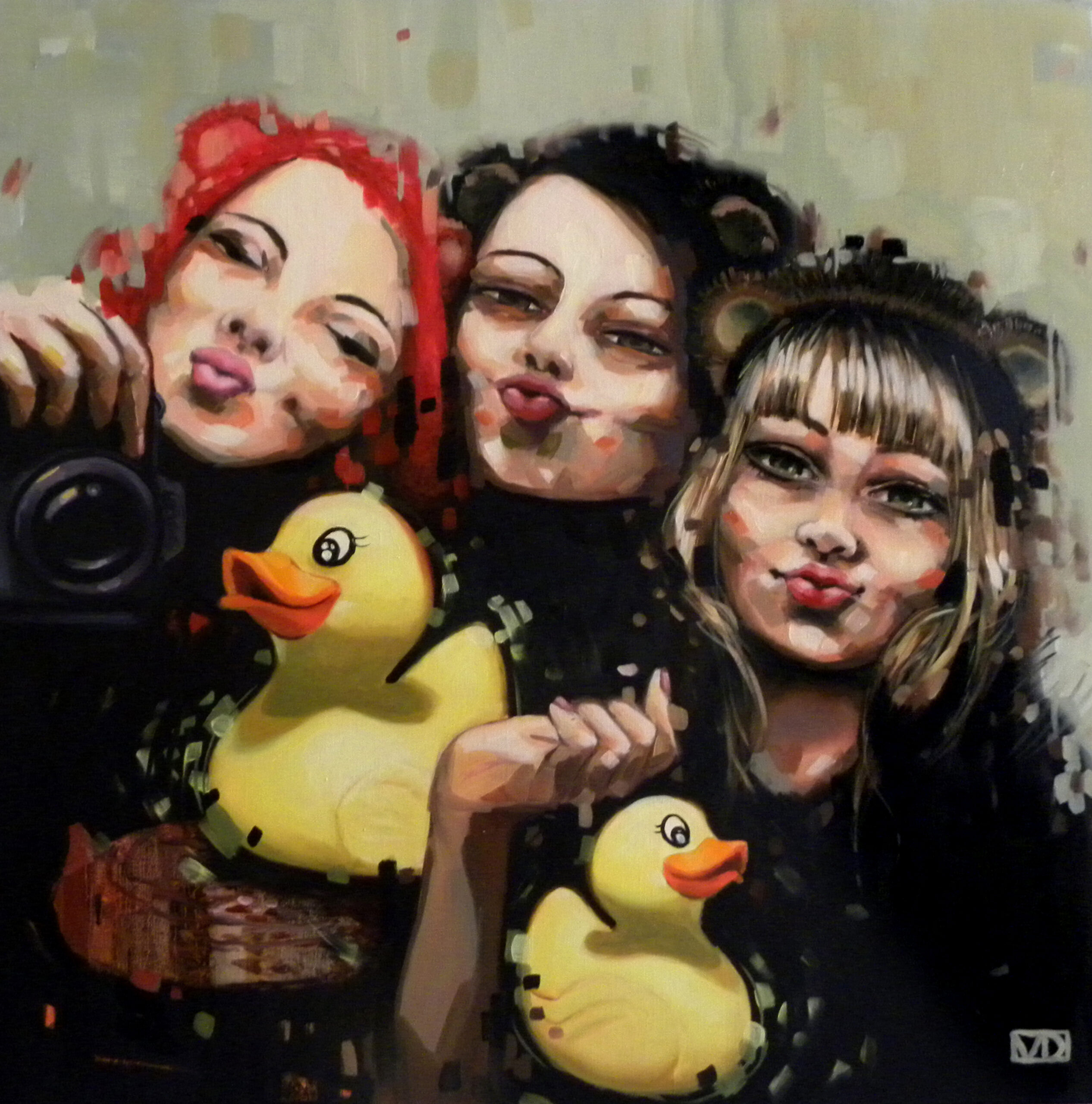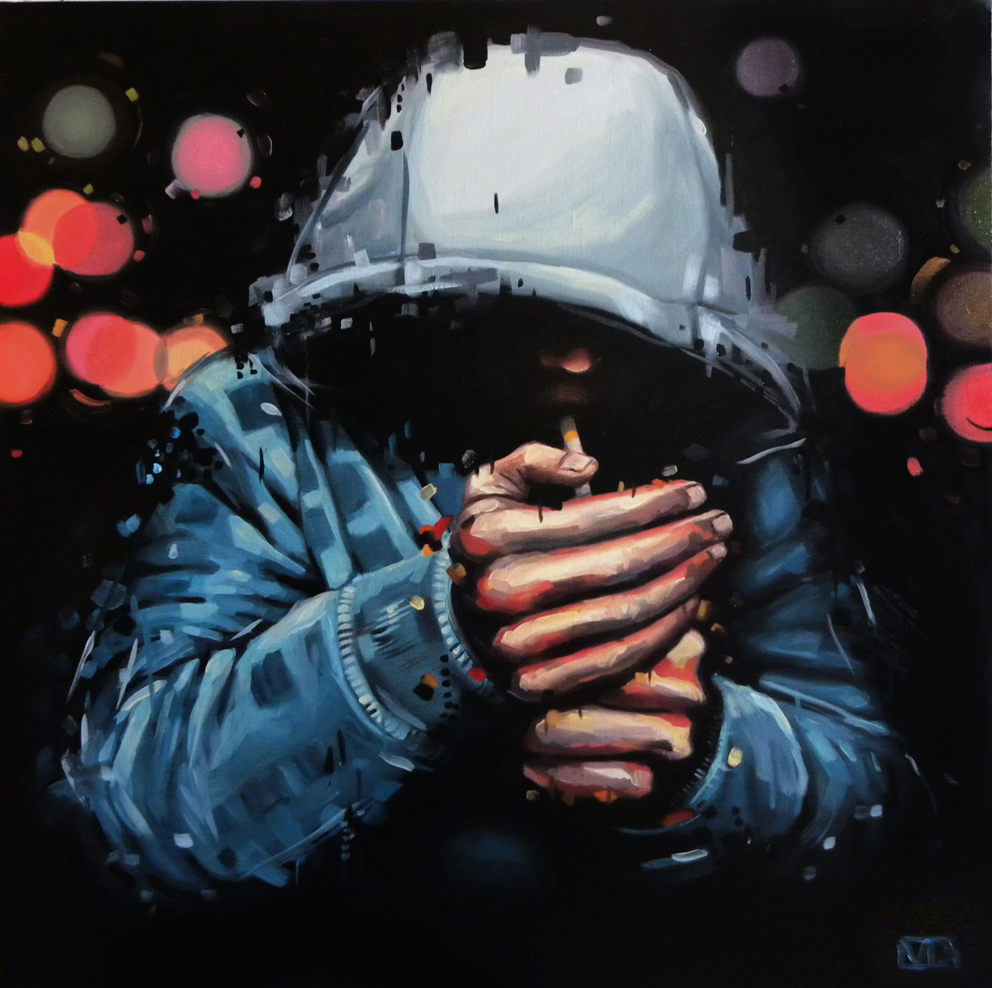 Les formats carrés, proches de grands polaroids, évoquent des instants sensibles et volés : fugaces, ambigus, intenses. Les peintures captent ce qui se joue — parfois sans se dire
